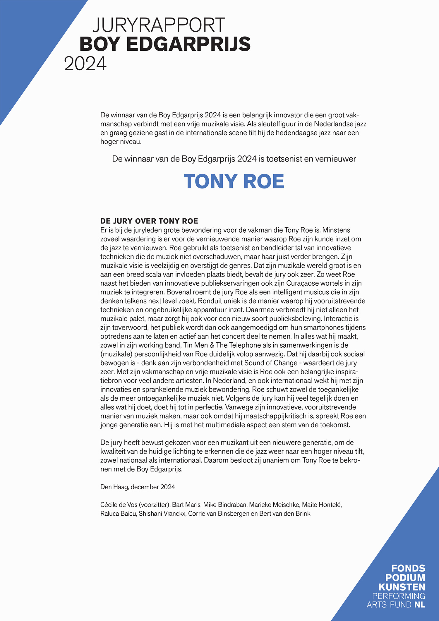 The jury of the Boy Edgar Award 2024 has unanimously chosen Tony Roe as the winner of the most prestigious award in Dutch jazz and improvised music. The Performing Arts Fund NL announced the news on 27 June during the inJazz Festival in Rotterdam, organised by Buma Cultuur.